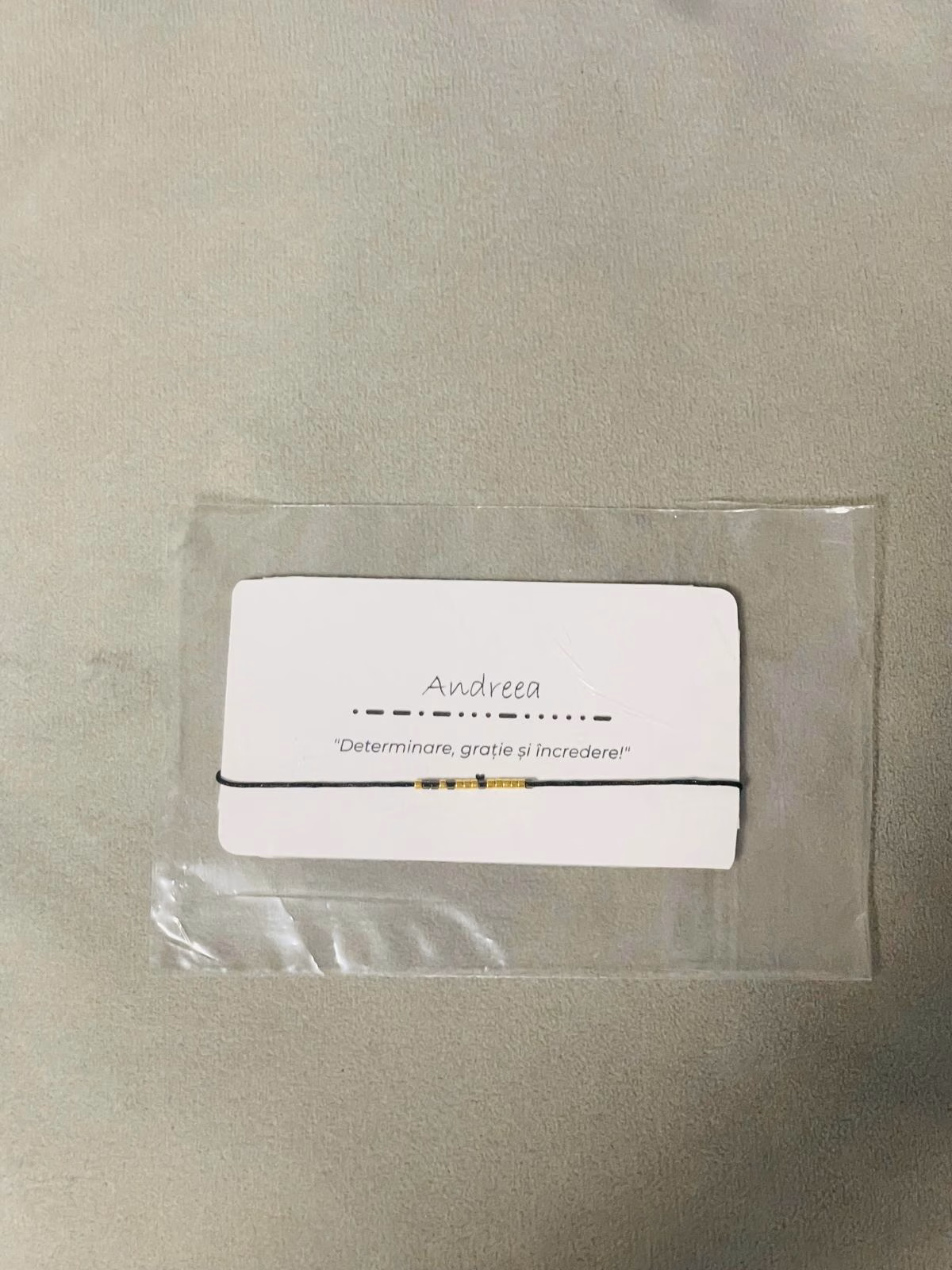 Personalizează-ți stilul cu brățara cod Morse Andreea, creată manual cu atenție la detalii. Brățara are un șnur reglabil negru, perfect pentru orice dimensiune, și bile Miyuki de înaltă calitate, aurii placate cu aur și negre, care formează cuvântul “Andreea” în cod Morse. Este mai mult decât un simplu accesoriu – este o expresie a eleganței și a personalității. Ideală pentru a fi oferită cadou sau pentru a-ți completa colecția de bijuterii unice.