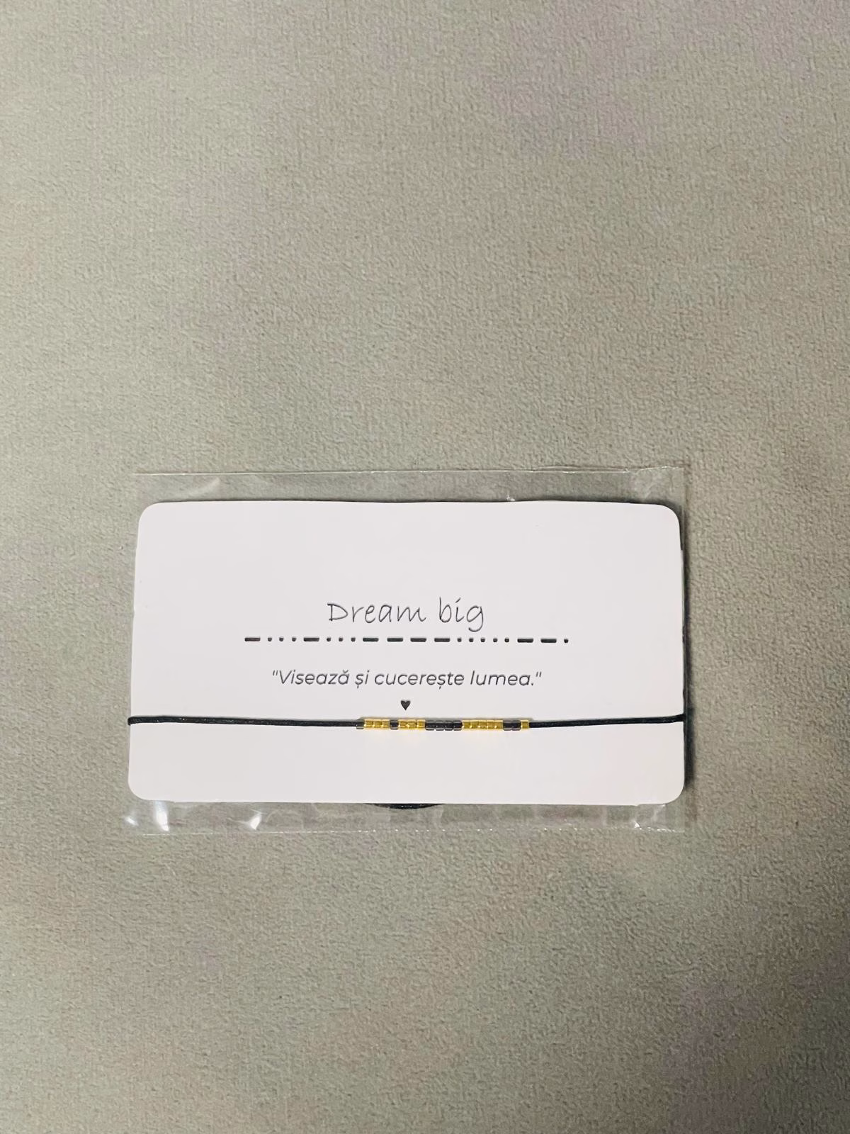 „Dream Big” este un îndemn la curaj și ambiție. Brățara cod Morse cu acest mesaj este lucrată manual și inspiră purtătorul să creadă în visurile sale. Designul minimalist și mesajul discret o fac ideală pentru a fi purtată zilnic sau oferită ca dar motivațional. Ambalaj inclus.