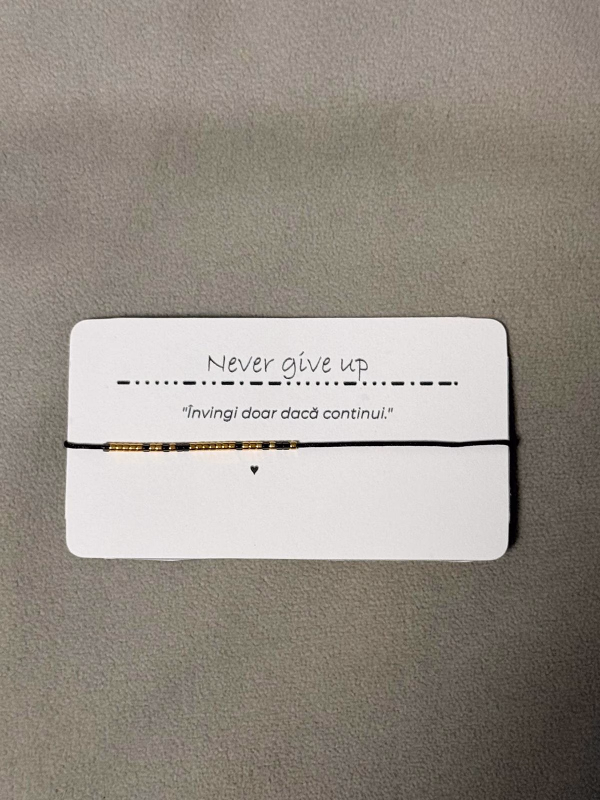 Un mesaj puternic, ascuns în cod Morse – „Never Give Up” este mai mult decât un accesoriu, este un motto de viață. Brățara handmade transmite în tăcere determinare și perseverență. Potrivită pentru oricine are nevoie de inspirație zilnică, fie pentru sine, fie pentru a încuraja pe cineva drag. Ambalaj cadou inclus.