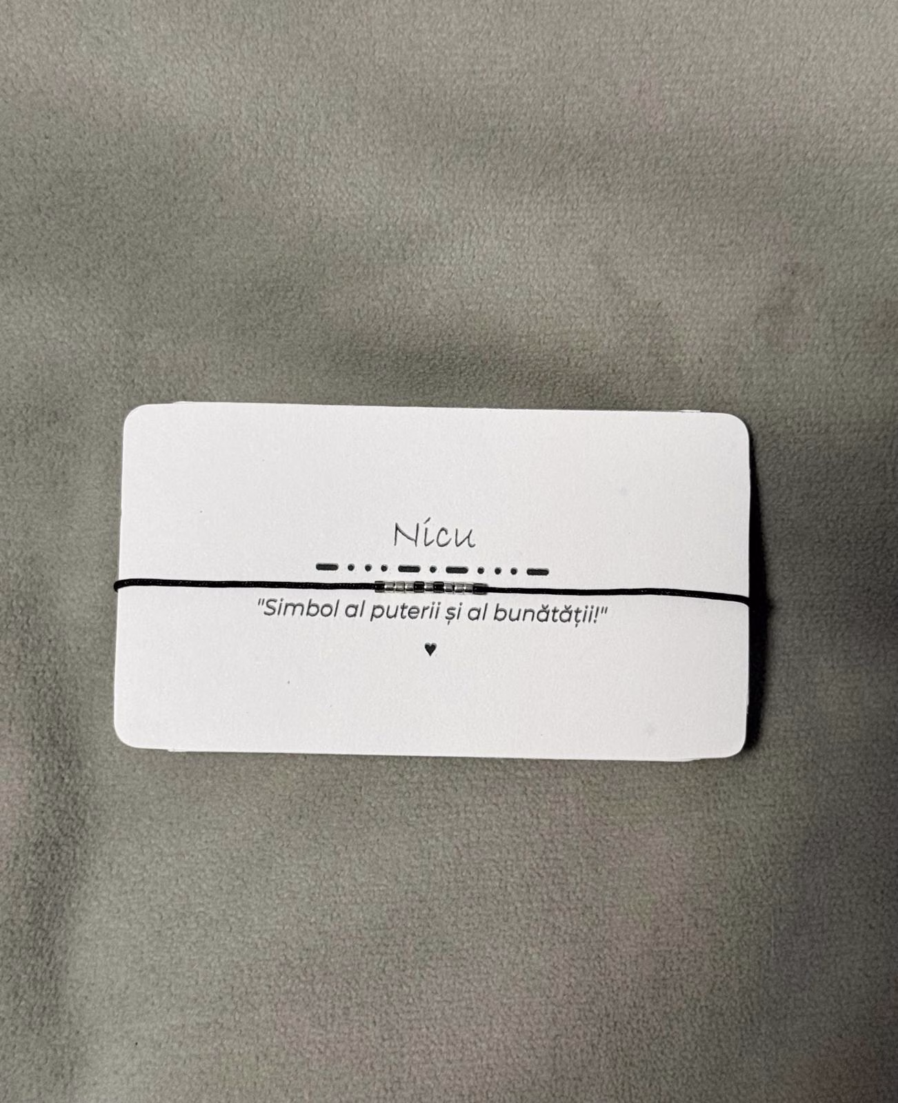 Brățara cod Morse Nicu este realizată manual din mărgele Miyuki argintii și negre, dispuse pe un șnur reglabil de înaltă calitate. Mesajul ascuns în cod Morse adaugă un farmec aparte, fiind perfectă ca accesoriu personal sau cadou cu semnificație. Designul minimalist și modern o face potrivită pentru orice ocazie.