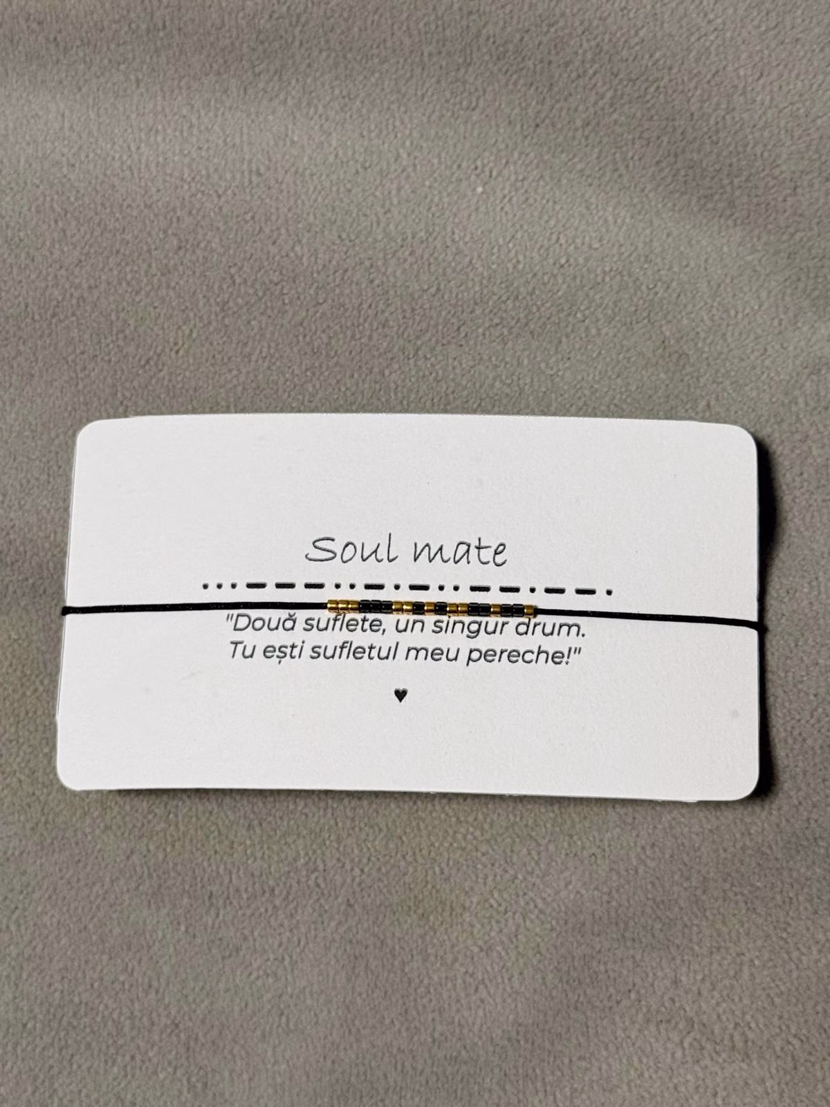 Brățară handmade, realizată manual, cu mesajul „SOUL MATE” transpus discret în cod Morse. Fiecare mărgea este așezată cu atenție pentru a reda exact semnificația simbolică, transformând bijuteria într-un mesaj personal și unic. Brățara „SOUL MATE” nu este doar un accesoriu, ci un simbol al legăturii puternice dintre două suflete care se completează reciproc. Designul minimalist și elegant o face potrivită pentru purtarea zilnică, fiind confortabilă și ușor de asortat la orice ținută. Este cadoul ideal pentru ocazii speciale – aniversări, logodne sau pur și simplu un gest de iubire – și vine ambalată într-o cutie cadou elegantă, gata de oferit. Această brățară nu transmite doar stil, ci și emoție, fiind un simbol puternic al conexiunii și al iubirii autentice.