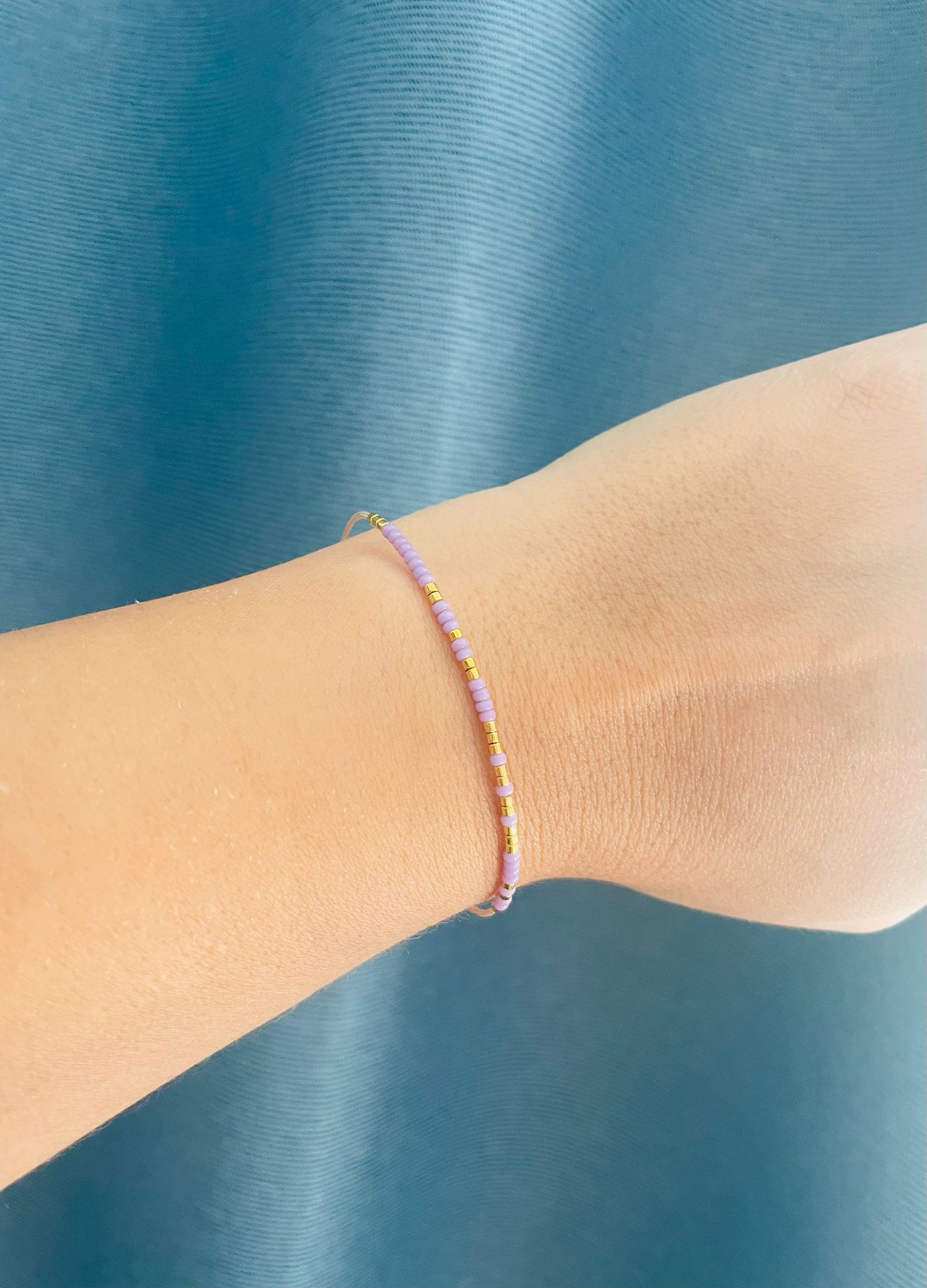 Mărgele Miyuki mov, cunoscute pentru calitatea și uniformitatea lor, împreună cu mărgele Miyuki placate cu aur de 24 de karate, care adaugă o notă de strălucire și rafinament.