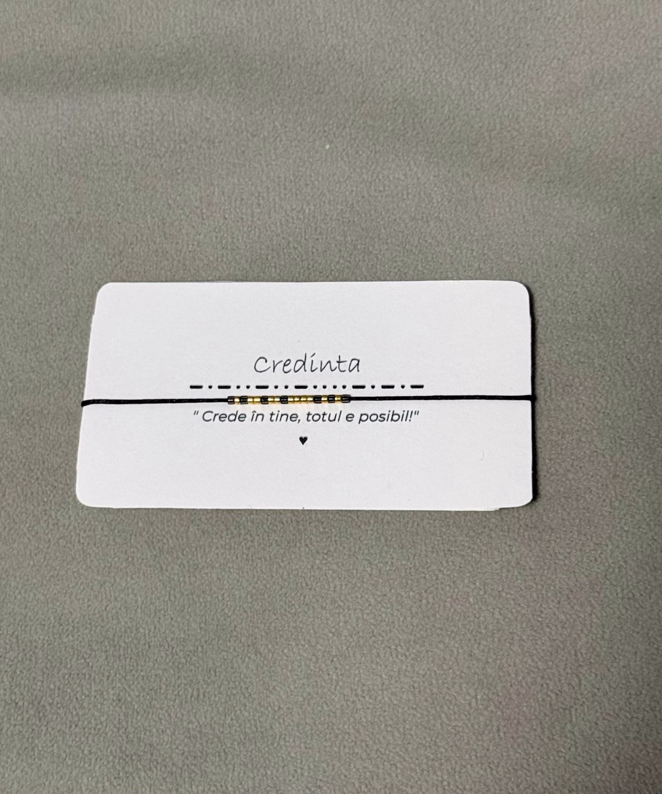 Brățară minimalistă cu șnur reglabil negru, decorată cu mărgele Miyuki negre și aurii ce formează cuvântul „credință” în cod Morse. Un accesoriu discret, ce simbolizează forța interioară și speranța, ideal pentru purtarea zilnică sau ca un cadou semnificativ pentru cei dragi.